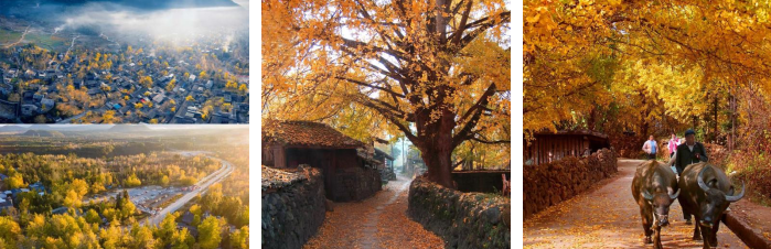 宛若漫步于一幅流动的油画。温暖的阳光透过金色的叶片洒下斑驳的光影,农家炊烟袅袅,构成了一派宁静和谐的田园诗画。这里不仅