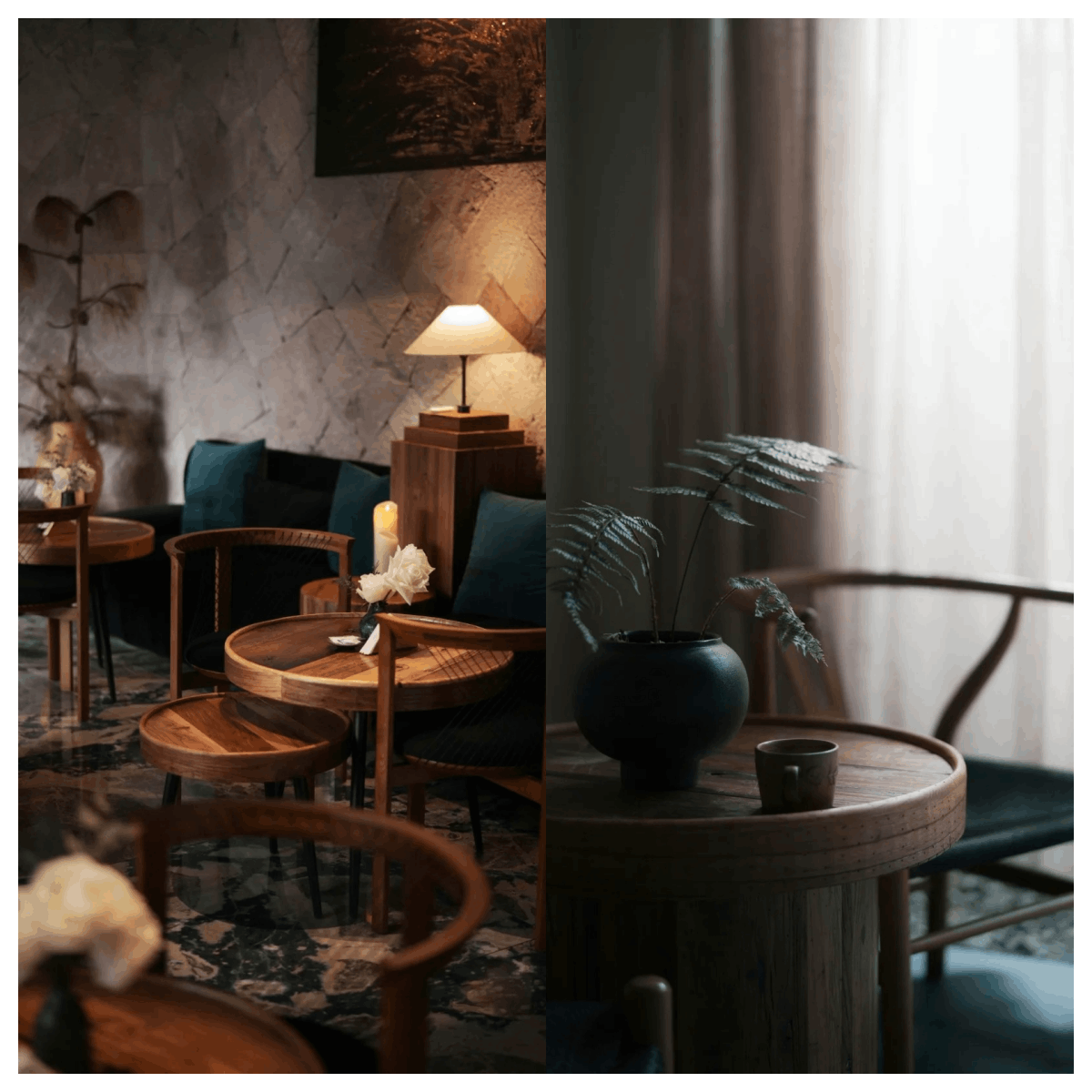 酒店占地有4500平,19间客房遍布各处。在设计上以禅意和侘寂风为主,融入了摩洛哥和东南亚风格,看似各异的风格搭配在一起和谐又高级。